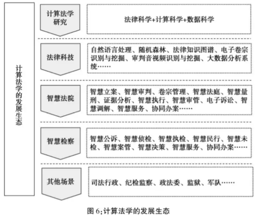 正如上文所探讨的,从学科发展的意义上讲,中国计算法学在当下大抵处于初期成长阶段,虽然目 前学界初步形成了以法律现实问题为逻辑起点、以数据资源为分析基础的方法论自觉态势,但是既有 的知识储备和技术条件难以满足急剧发展的时代诉求,也不断面临着来自分析方法和思维模式的双重 叩问,何海波(2018)指出,“对局部裁判文书的手工统计是目前最为流行的方式”。但是,当学界还在来势汹涌的大数据狂潮面前“踌躇犹疑”之时,法律实务界追摹大数据前沿的脚步俨然称得上是“铿锵 矫健”,围绕法治建设的应用大数据技术已然全面展开,立基于大数据、信息化的发展理念也逐步深植于法律各个领域内,业已形成了自身的发展生态(见图6)。也正是在这样的意义上,计算科学、大数据技术在法律实务界的实践与应用,也为计算法学的学科建构提供了更多的经验镜鉴和现实指引。更进 一步讲,全新的时代课题也在一定意义上刺激了高校不断调整自身的人才培养模式和目标,并力图整 合内外优势资源,全方位推进多专业渗透的复合型人才培养模式。