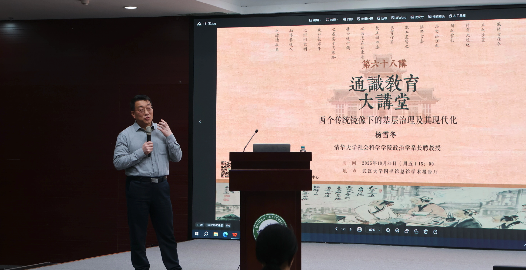 2025年10月31日下午,通识教育大讲堂第六十八讲在武汉大学图书馆学术报告厅举行。本次讲座由武汉大学本科生院和通识教育中心联合主办。讲座开始前,武汉大学通识教育中心副主任彭华教授为杨雪冬教授颁发了“通识教育大讲堂主讲人纪念证书”。