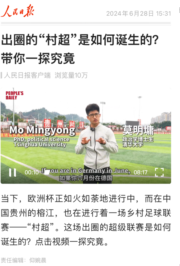 《解码中国基层治理》系列节目由人民日报社策划推出,聚焦新时代中国基层治理的生动实践。我校博士生莫明墉自2023年12月起担任该节目主持人,并参与策划;我校政治学系长聘教授、系主任杨雪冬担任该节目专家顾问。节目第一季共5集,涵盖贵州“村超”、湖北“村湾夜话”、浙江“乡村CEO”、山东“儒家文化村”、上海“国际多元社区”等优秀基层案例,以微观视角展现中国国家治理的创新与活力。节目发布后获得人民日报社领导高度认可,莫明墉受邀于2025年1月赴人民日报社作专题汇报。目前,该节目第二季正陆续发布中,选题涵盖新疆沙漠治理与江苏“苏超”等案例,持续展现中国式现代化的基层经验。